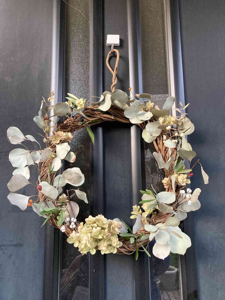 アドベントに入ったので、玄関にクリスマスリースを飾りました‼️リサイクルの台に、伸びすぎたユーカリポポラスとオリーブと、カシワバアジサイと、拾って来たナンキンハゼを適当に刺しただけですが、結構素敵に出来て嬉しい❣️❣️