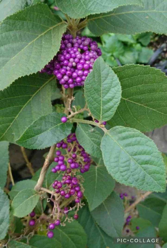 とにかく実が鈴なりで重そうに枝垂れてるのはコムラサキですね、ムラサキシキブはもっと普通の木チックで実はパラパラです。