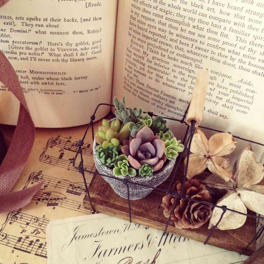 ワイヤーカゴに 木の実&多肉のミニ寄せ植え♡