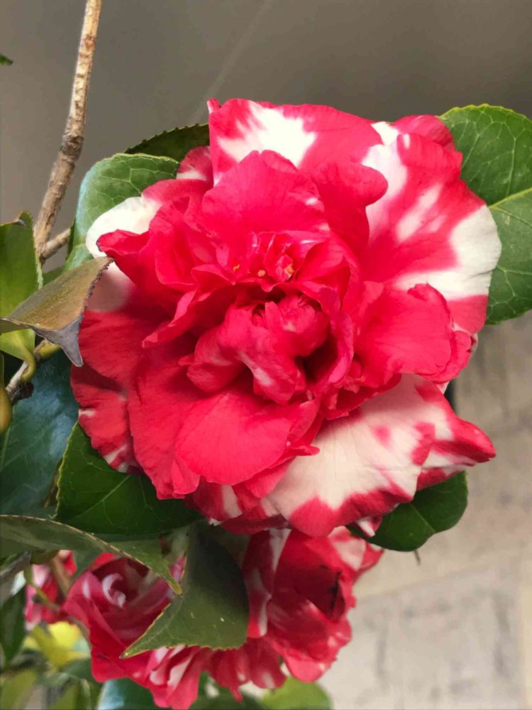 マンションの玄関先に咲く椿の花
