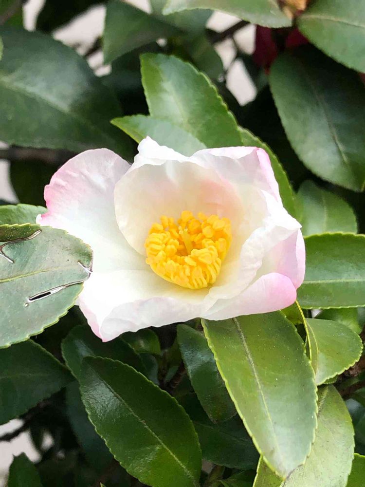赤に混じって白いのも咲いていました〜多分…サザンカだと思います〜薄いピンクの縁取りが可愛い💕