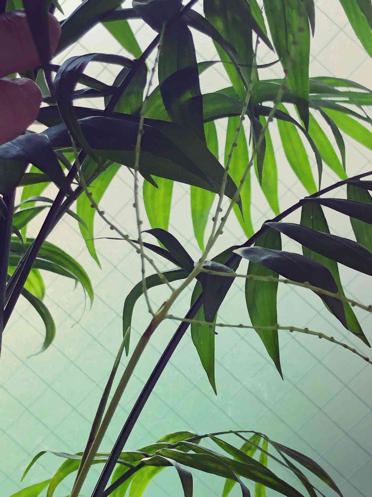 今朝テーブルヤシに水遣りしようと見たら葉🌿とは違う小さな粒々がついた枝を発見しました。