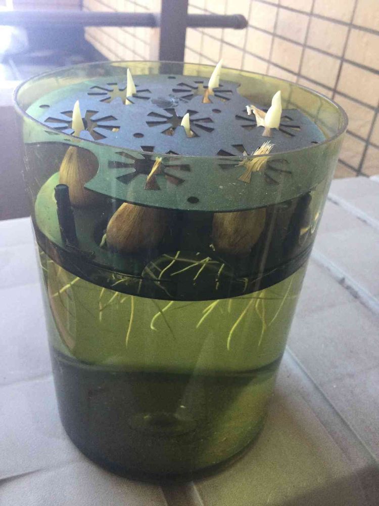 11月12日から始まった、ミニアイリスの水耕栽培です。寒さにしっかり当てる様に書いてあるので、フェンスの下の日の当たらないところに置いています。そこそこ根が伸びてきてるようです。