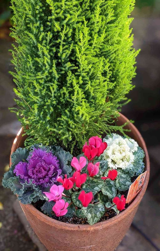去年から、植えてたゴールドクレストが大きくなったのが有ったので葉牡丹とシクラメンを足したそうです💜🤍♥️💗