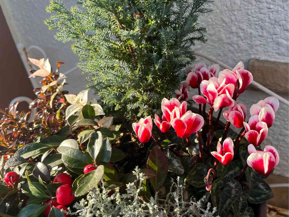 西日が傾いてきて、ちょうどクリスマス寄せ植えに当たっています☀️