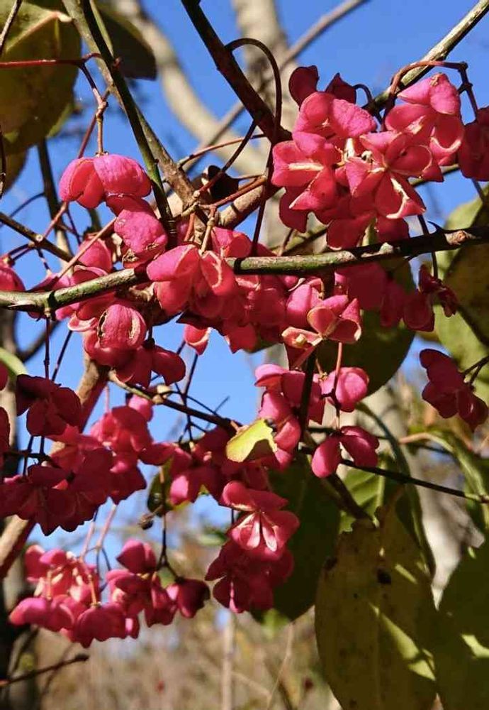 ニシキギ科ニシキギ属の落葉小高木。野山の明るい林や林縁に生え、庭や公園にも植えられる。葉はやや細身の卵形で厚みがあり、鋸歯は細かく、不揃いのミシン目のよう。花期は5~6月。淡緑色の4弁花がたくさん咲くが、小さな花で葉の色に溶け込んであまり目立たない。秋に熟す果実は径1㎝の四角形で淡紅色、果皮が4裂し橙赤色の種子が吊り下がる。種子の表面に果肉状の仮種皮(かしゅひ💬種子の外側を被って種皮のように見えるもの。普通の種皮より柔らかく肉質)があり、これが鳥への報酬。春の新芽は山菜として利用されるが、果実は有毒なので食べられない。