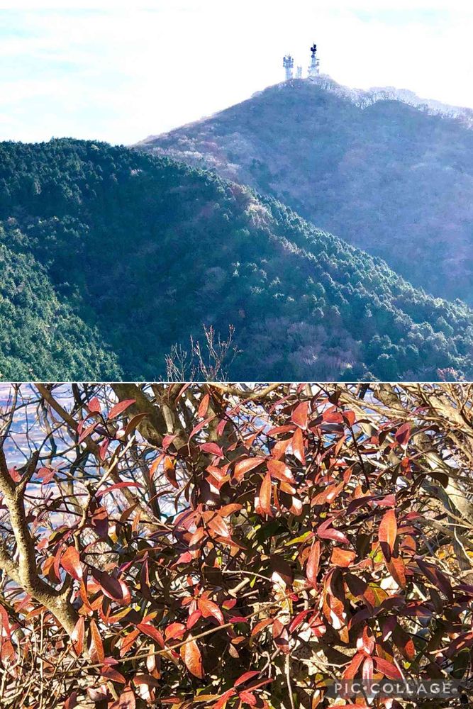 薄暗い落ち葉だらけのわかりにくい道を腰を痛めそうになりながらも、展望のきく小ピークに。まだ頂上まではひと登りだなあ…塔が立ってるのが筑波山の双耳峰の男体山(女体山の方が少し高い)⛰