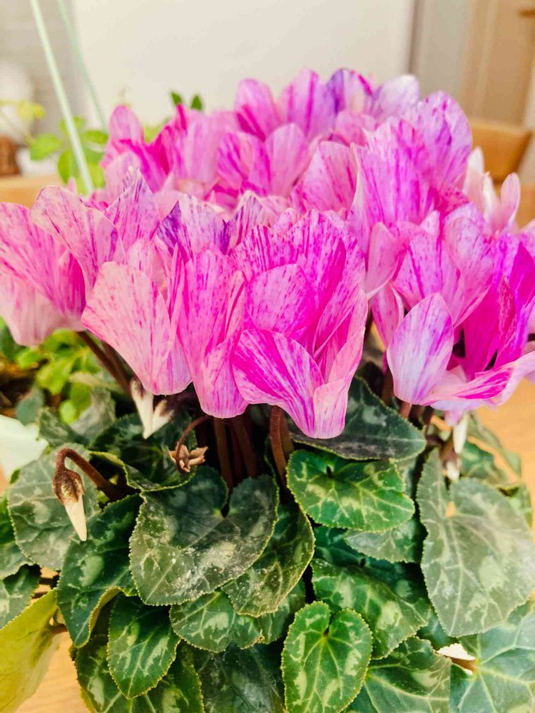 仏にはあまり色んな種類のシクラメンがありません☹️ チロリアンさんのシクラメン とても綺麗な色ですね✨💗 斑入りのシクラメン初めて見ました😃