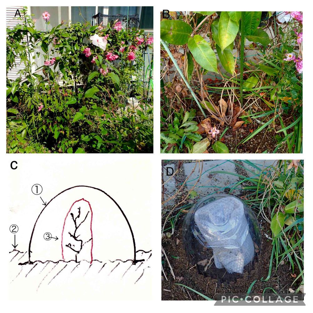 マンデビラ・ローズジャイアントの冬越し・苗ドームの設置、Aは9月の満開時、Bは、マンデビラの根本、20cmを残してカット、CはDのイラスト①苗ドーム ②苗ドームが風で飛ばされないよう土で覆う、③マンデビラの幹をプチプチのビニールシートで巻き、麻綱で軽く縛る、冬越し期間、来年3月下旬まで。
