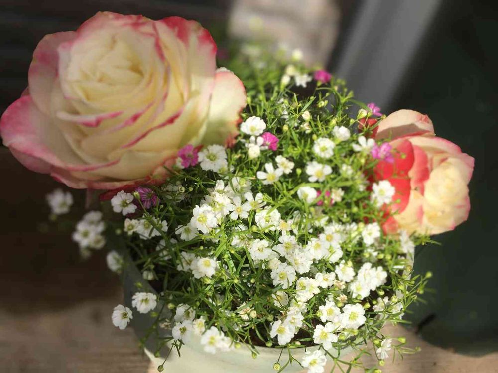 昨日雨を含んでしまい重そうに枝をしならせて下を向いて咲いていたので、カットし、かすみ草の鉢に乗せて🤳