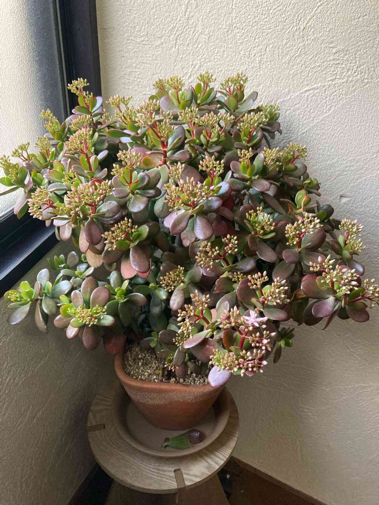 金のなる木の蕾が開き始めたので、室内に取り込みました。結構大きくなってきているので、軒下で越冬させるか悩んでます。
