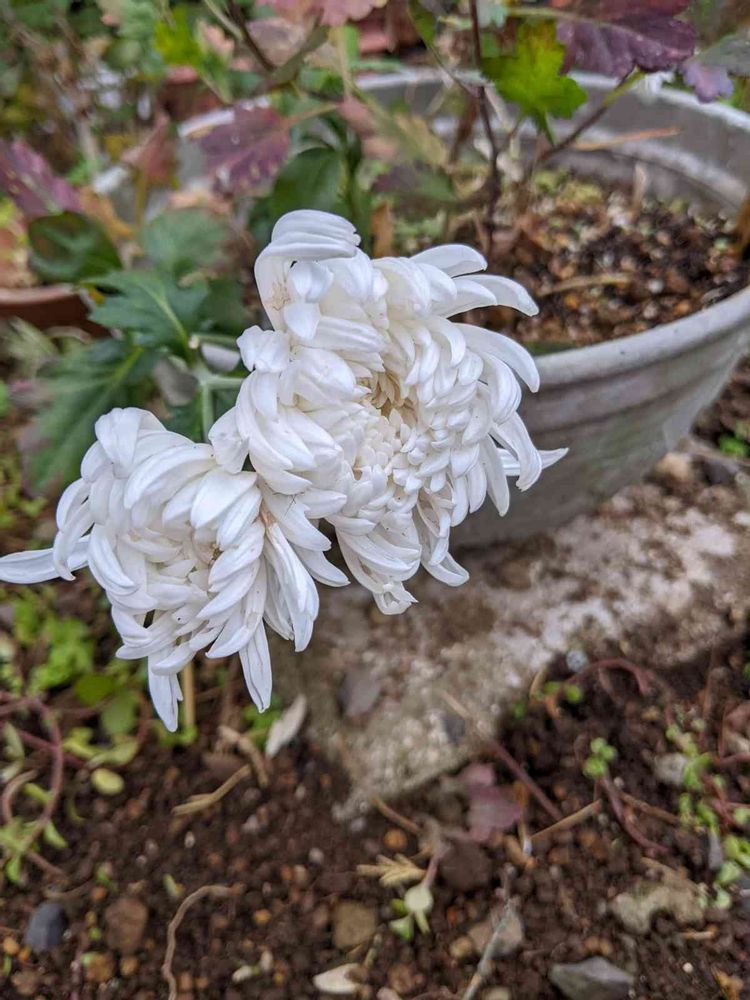 夏頃挿し木していた、切り花からの、菊の花🌼白色。花が開きかかってきました。🤩🌼🏵️🌦️🙋