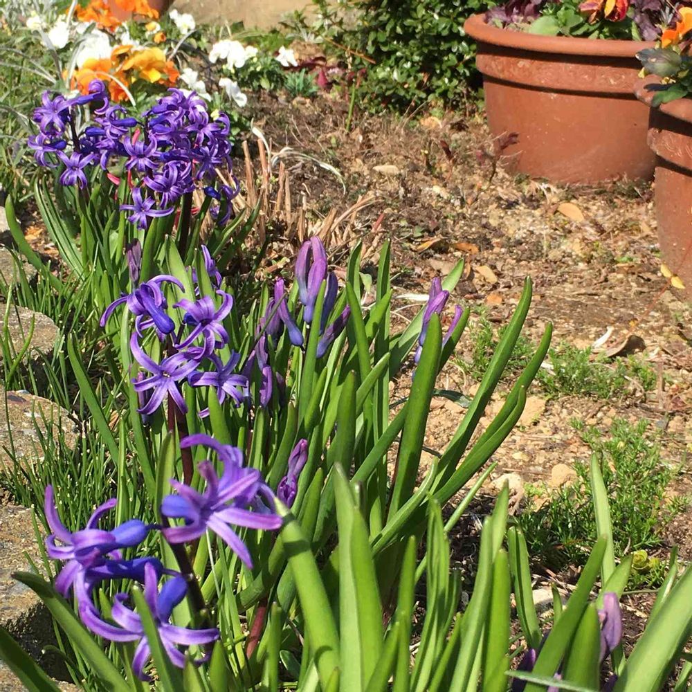 地植えのヒヤシンスコーナー😊横に見えてる細いほそい葉っぱは原種の水仙です。まだ咲きません〜