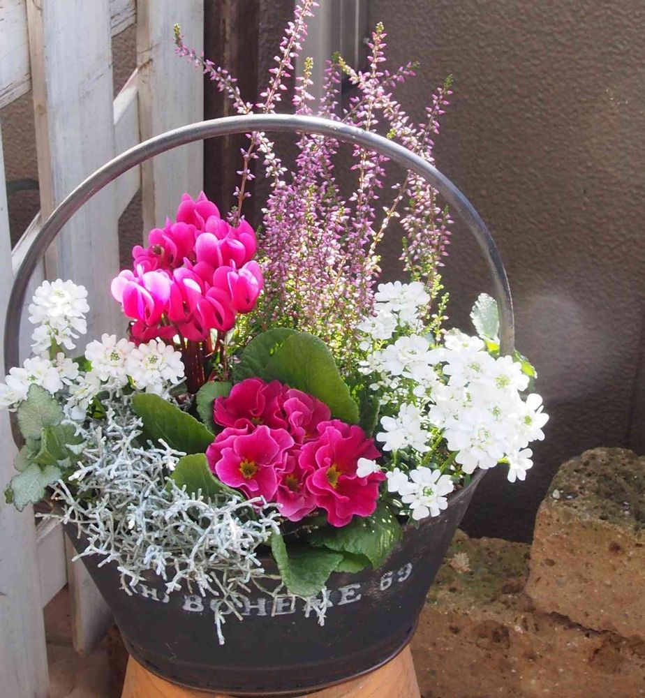 持ち手付のブリキに♪シクラメンとジュリアンの寄せ植え