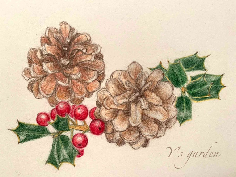 松ぼっくりとホーリーを色鉛筆で描いて、クリスマスカードを作りました。