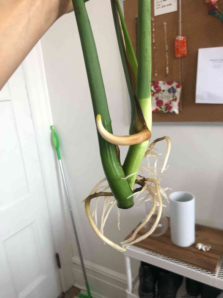 1ヶ月ほど前、バイト先のカフェのモンステラ、伸びすぎてるところをチョッキンして持ち帰ってきた子、水差しでもりもり根が出ています。