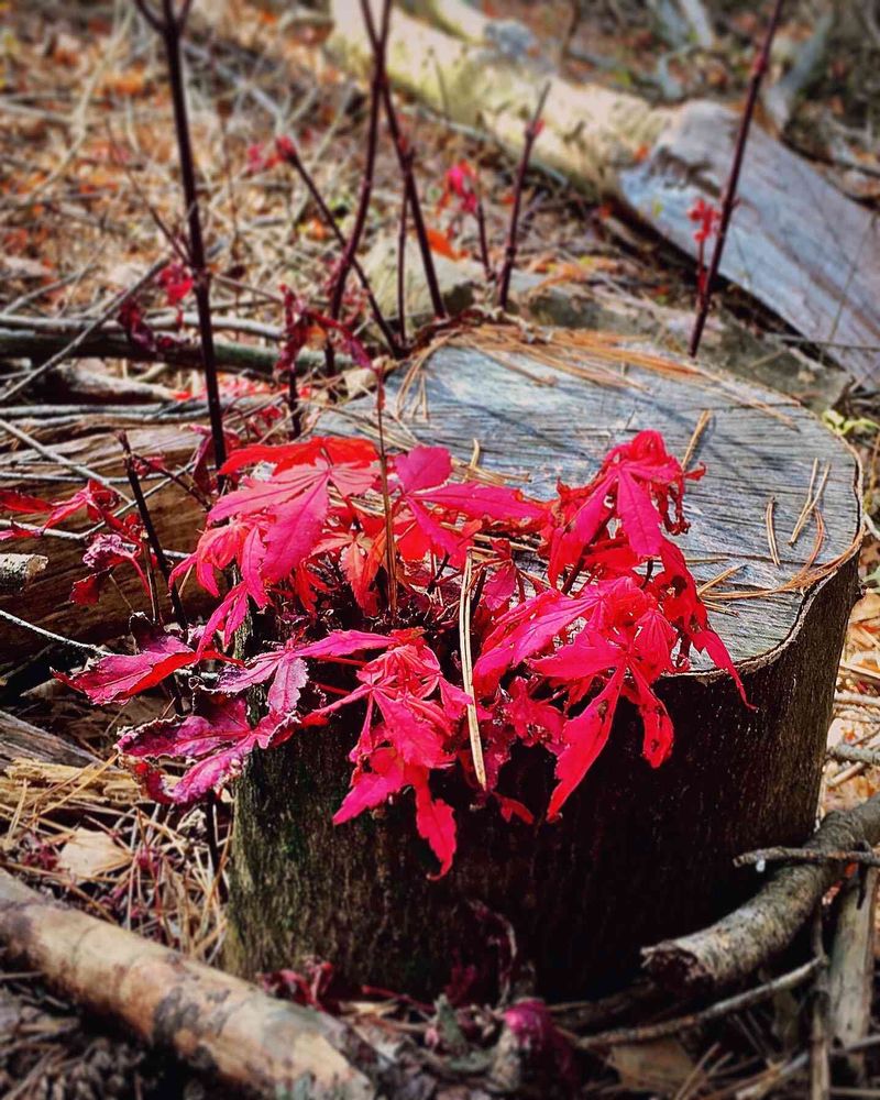 切り株からモミジの葉っぱの紅葉、生命力を感じます
