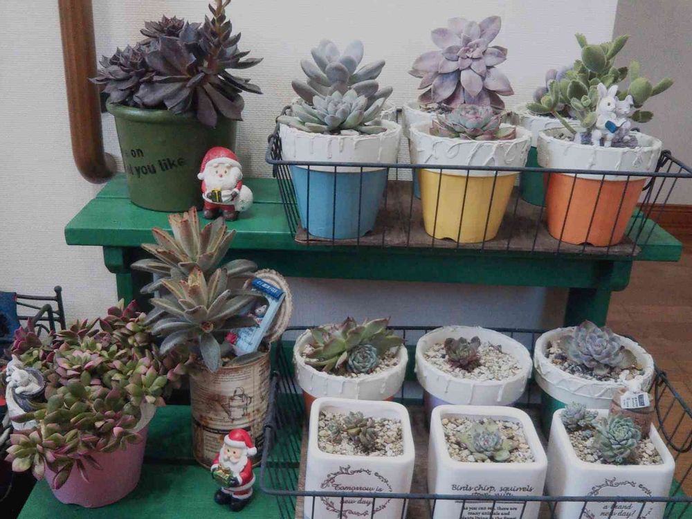寒さに弱い多肉さんたちを、昼間暖かい時は外に出し、夕方からはこの緑の台に飾っています😊🍀