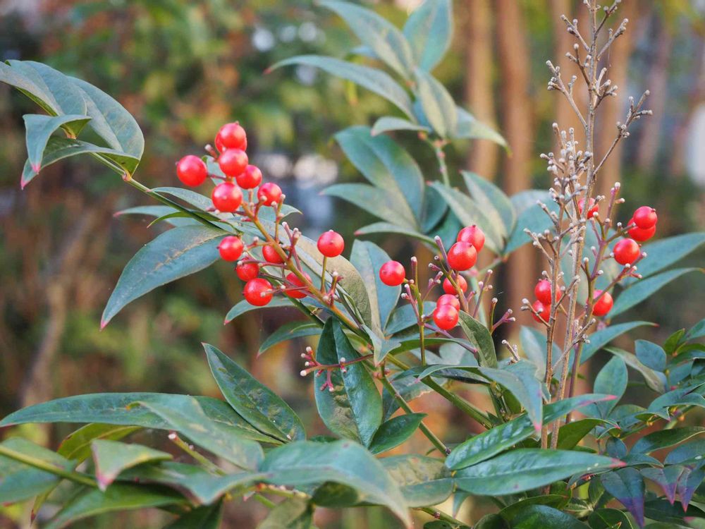 花が少なくなってくるこの時期、赤いナンテンの実は目立ちますね。