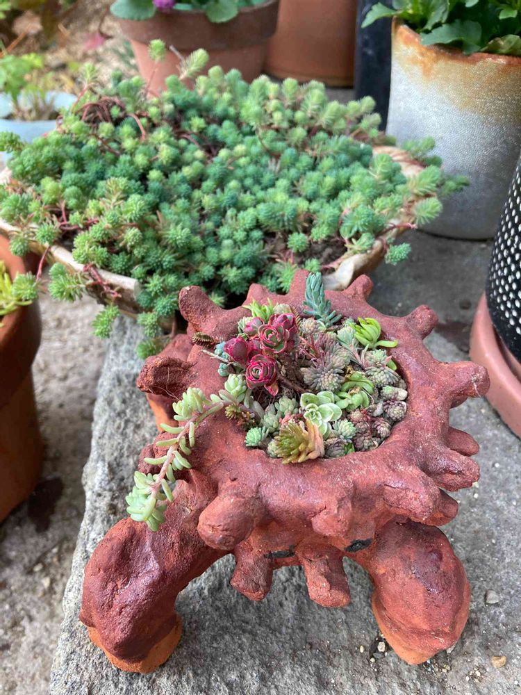 鉢に風情や個性があり、セダムちゃんが輝いてます。私もひびが入ってる土鍋は鉢に変身 なんだも勿体無い派です🤗