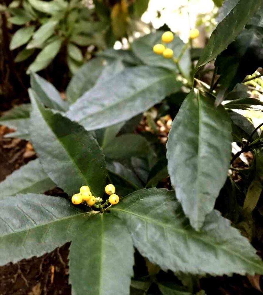 梅の木の下のツツジの陰に葉っぱが千両にそっくりで黄色い実をつけたコを見つけました。これから赤くなるのかな(˙˘˙*)?