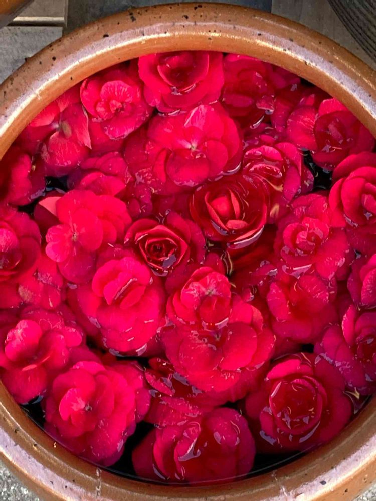 GSでよく投稿されている花手水を町の写真館で見ました。カメに水をはり花びらを浮かべていましたよ。今度 ウチのサザンカを浮かべてみよう。