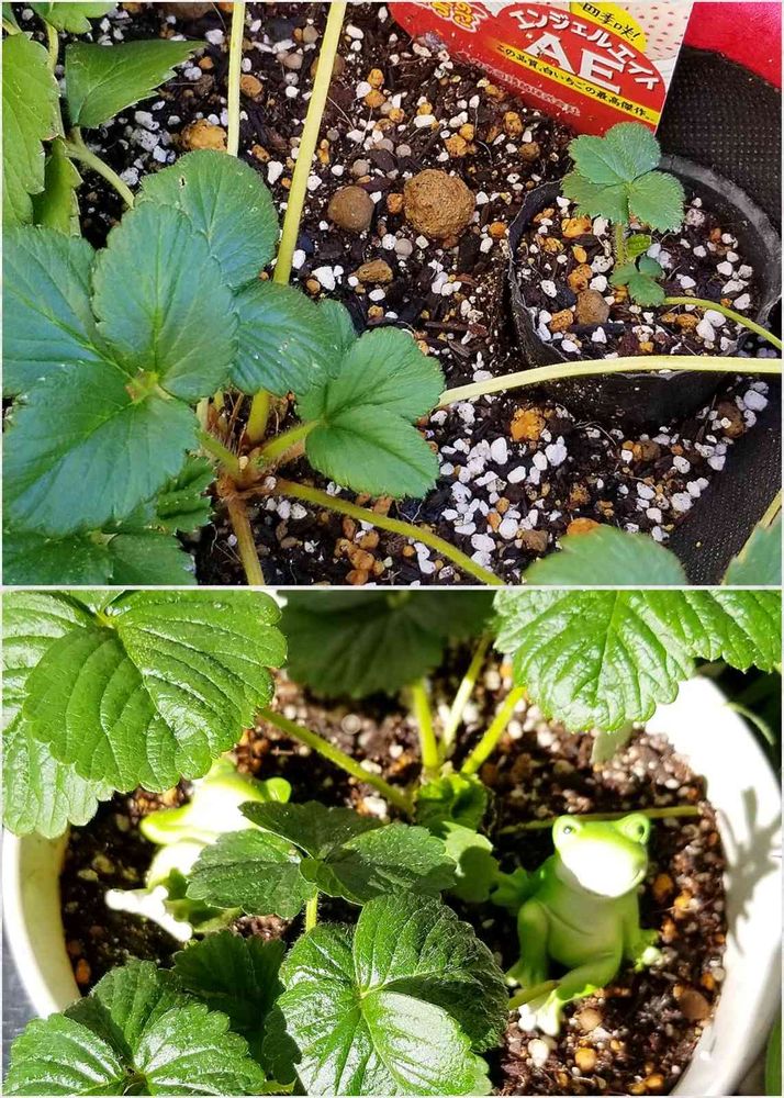 下は四季成りイチゴのランナーから成長したので独立させた苗2株が植えてあります🌱🌱🐸さん日向ぼっこ中〜