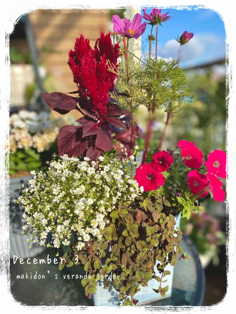 蕾だけのコスモスは無事に咲きそろい、ケイトウはまだ赤色の輝きを保ってます❤️
