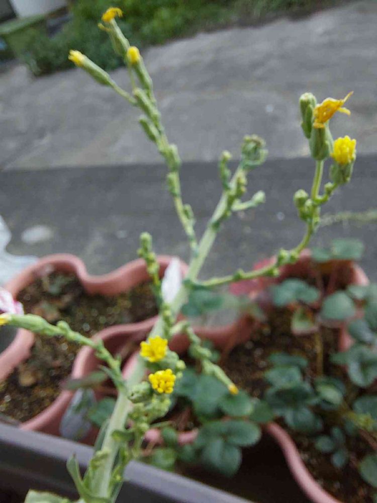 プランター栽培してるロメインレタスに黄色い蕾·花が咲いて💛もう葉は固くて食べられない😂