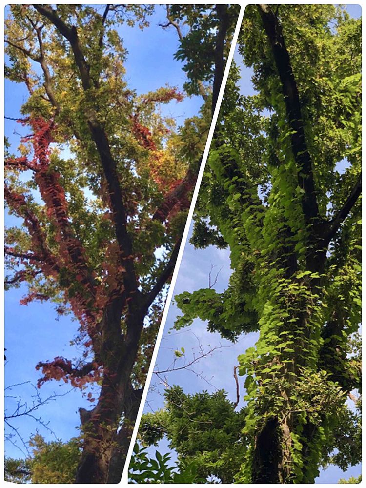 9月のワクチン接種の後見つけた蔦が絡まった大きな欅の木(右)、先月散歩で行ったたら、蔦が赤く紅葉していました(左)💛🧡❤️✨