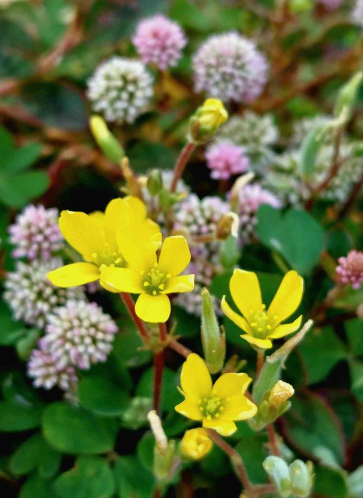 足元に可愛いポリゴナムとカタバミが仲良く咲いています✨