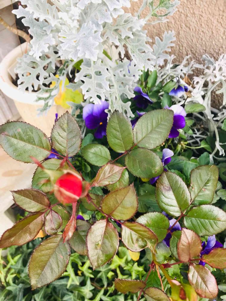 玄関前〜寄せ植えのミニバラの蕾が赤く色が付き咲いてくれるのが待ち遠しいです〜🌹