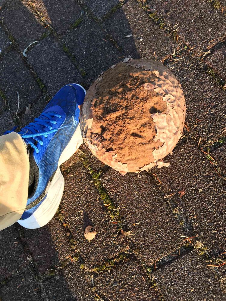 たぶんオニフスベというキノコの一種ですね。最初は白くてきれいな印象があるらしいのですが、私が見つけたのはもう末期でこんな感じでした。これまたいつものウオーキングコースで見かけました。直径は20cm以上ありますよね。皆さんは見たことありますでしょうか?