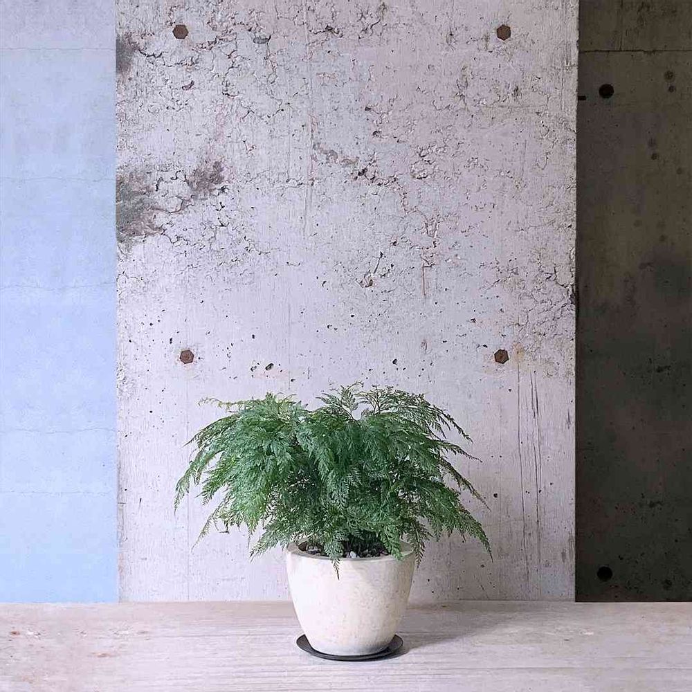 クリームPOTに黒のアイアン皿、クラシックなイメージのレース状の葉をコーディネートしたモードな気分のひと鉢です。
