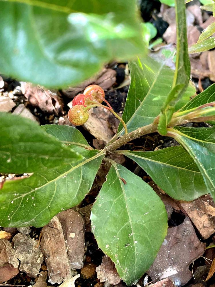 🌿をかき分けたら 薄っすら赤く染まった実が付いてたよ😊