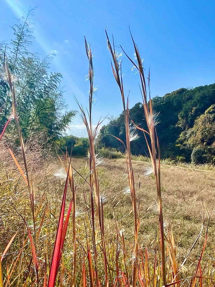 葉の赤、空の青、綿毛の銀の輝き…