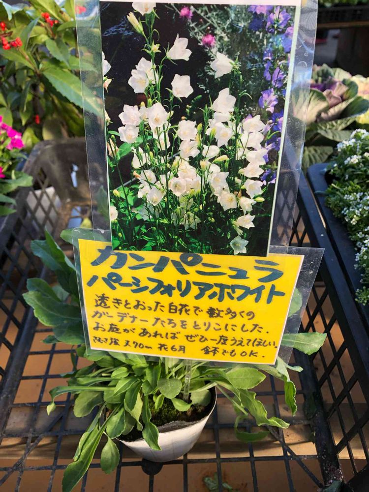いつもの激安園芸店 珍しく、推してる花がありました😃 「数多くのガーデナーたちをとりこにした」って書いてある⁉️ しかもラスイチ 89円だし、騙されたと思って買ってしまった😅カンパニュラパーシフォリア ホワイト 来年どうか私をとりこにさせる位の、素敵な花を咲かせてください🙇♀️