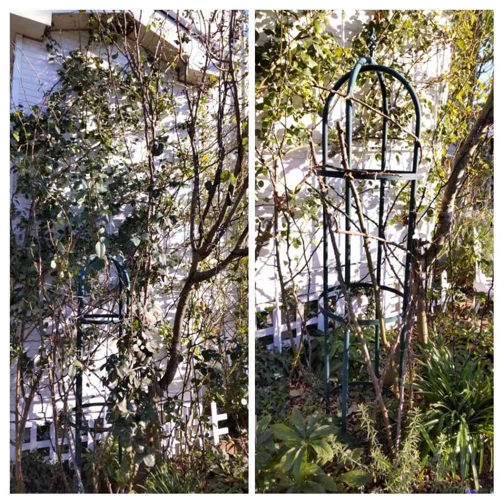 今日からつるバラの誘引作業を始めました。まずは北風が吹きつけやすい場所にあるシャンテロゼミサトから。オベリスクの2倍以上に伸びてましたが思いっきり切り詰めてます。