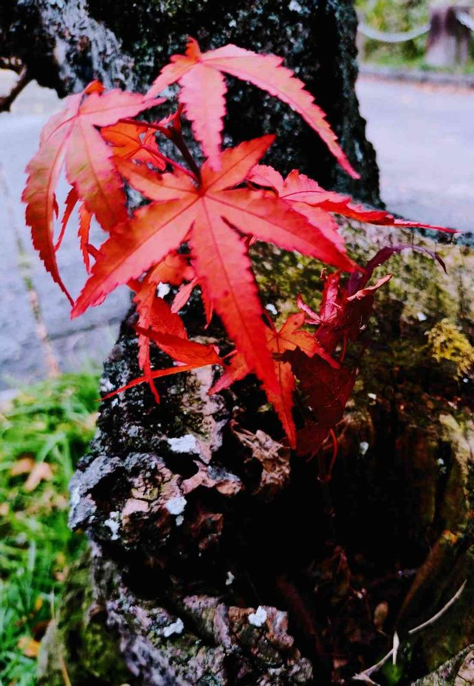 南郷公園(京都丹波亀岡)の、桜の枯木の切り株に、小さな楓が紅葉しています。