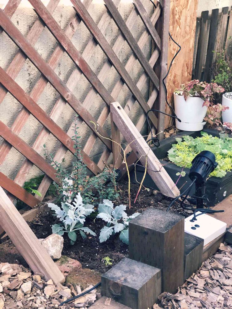 今回も花壇の枠は、お金かけずホームセンターで買った端材と庭に転がってたレンガを置いただけ。熟練してきたらもっとしっかり作ります。