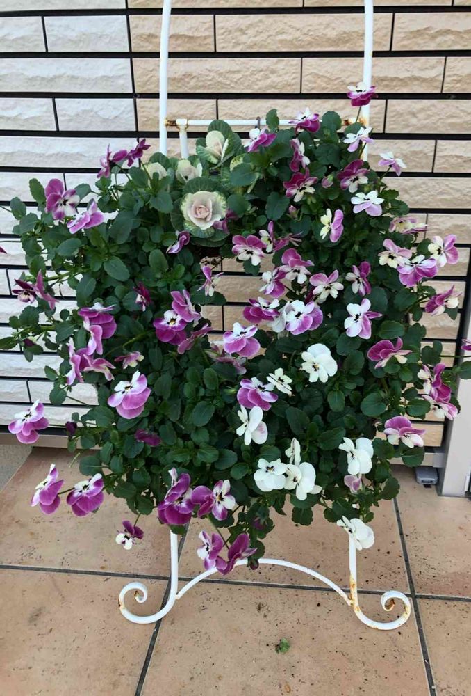 11月に植え込んだビオラ(おかめももか)とミニ葉ボタンのリースが花いっぱいになりました