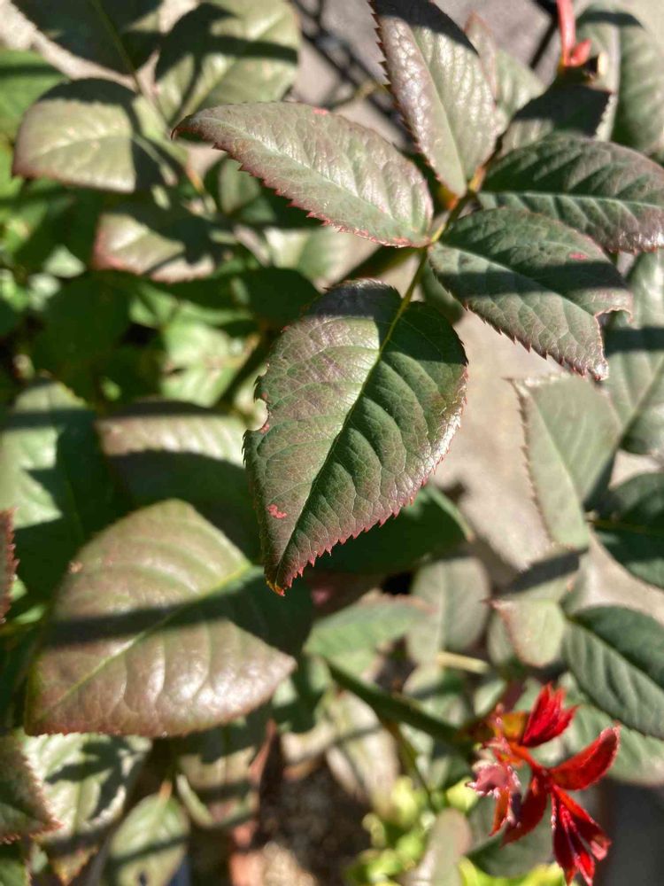 バラの葉っぱ、縁から赤くなってるけどなんだろ。紅葉?新芽が赤いのは学んだけど、濃い緑の葉っぱの縁や面が赤くなってるの気になるなぁ。