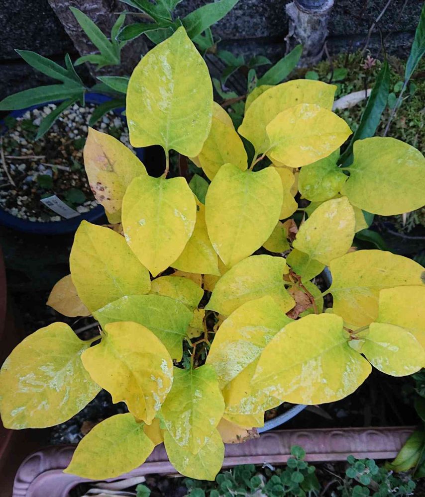 斑入りイタドリの葉っぱが黄葉していました。斑入りのところは、シミのように白くなってるみたいです。