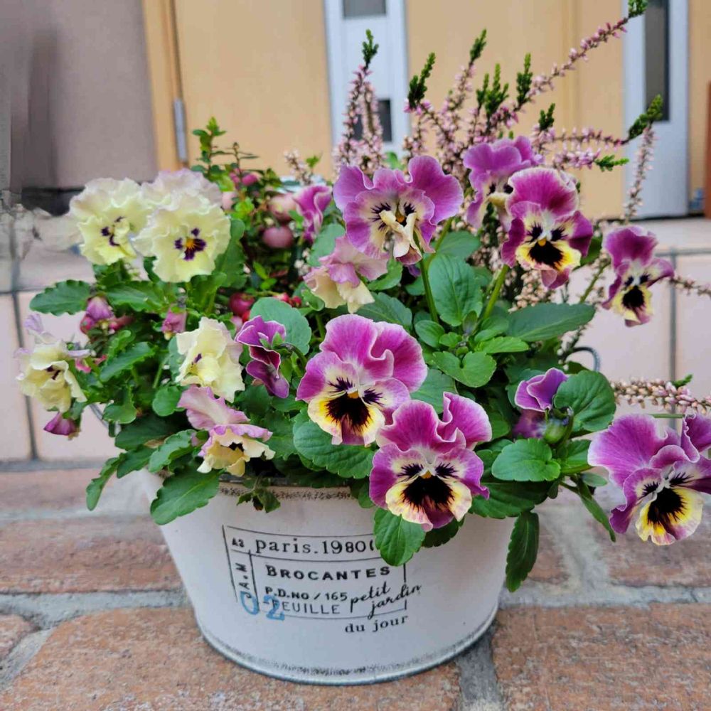 フリズルシズルミニタペストリーと夢見るパンジーワンダーシェード、ハッピーベリーが隠れ気味、後方にはラナンキュラスの球根から、もう芽が出てます🌱