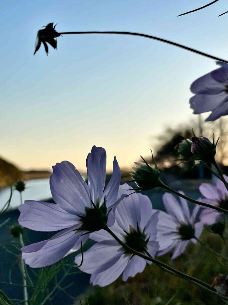 夕暮れ空とコスモスの透けた花びらが、綺麗ですね。