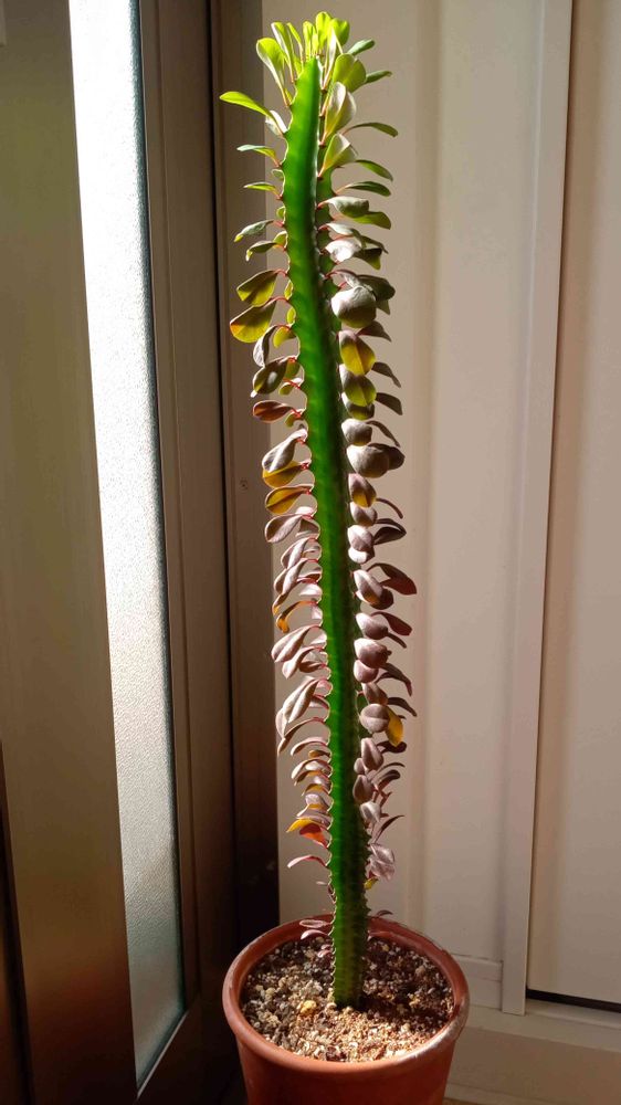 以前は外で、太陽光浴びて伸びてたけど、時々強い風吹くと鉢ごと倒れてたので、室内、玄関内で甘やかして育成してます♫