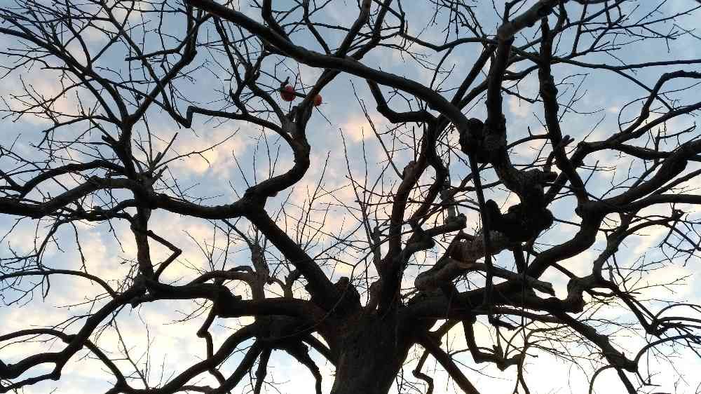柿の実が無くなって、寒そうな渋柿の木です。