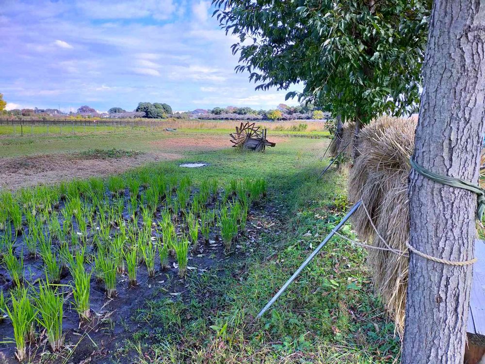 と、見間違う🌾稲の切り株ですね、爽やか~🌱😃 奥にある農機具(?)も素敵❣️