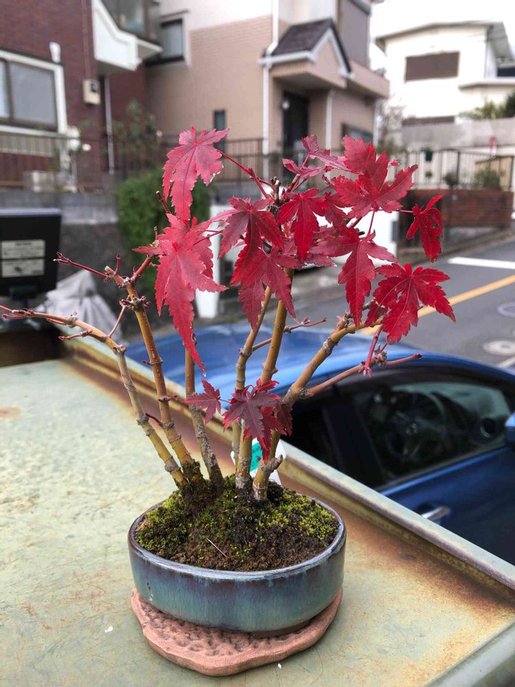 平成28年に寄植えした「山もみじ」です。紅葉が進みかなり赤くなりました。一部葉が擦れた状態でした。