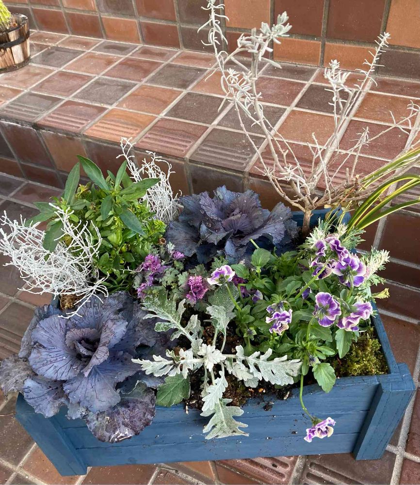 コンテナは100均の木箱をペイントしました。今回は前回の葉ボタンも足したので、